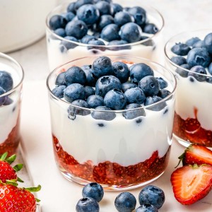- To assemble your parfait cups, layer each with the strawberry mixture, then the cheese yogurt mixture followed by fresh blueberries as shown.