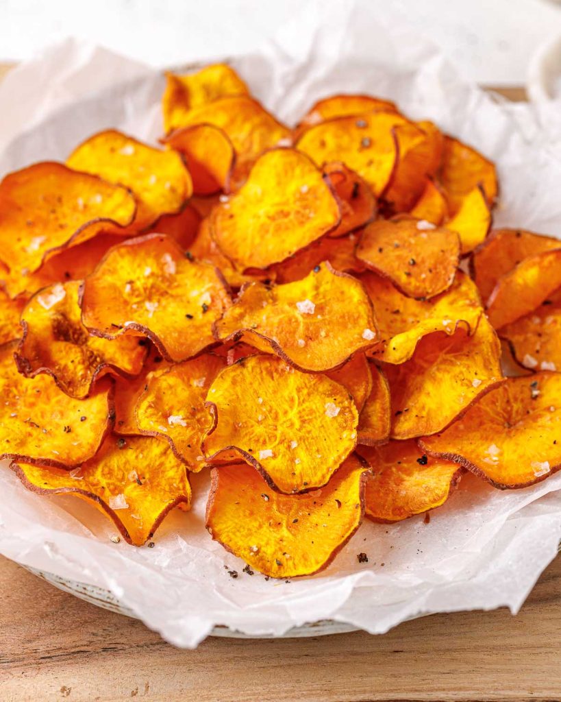 They are also delicious mashed, roasted, cut into fries, and baked or air-fried like these sweet potato chips.