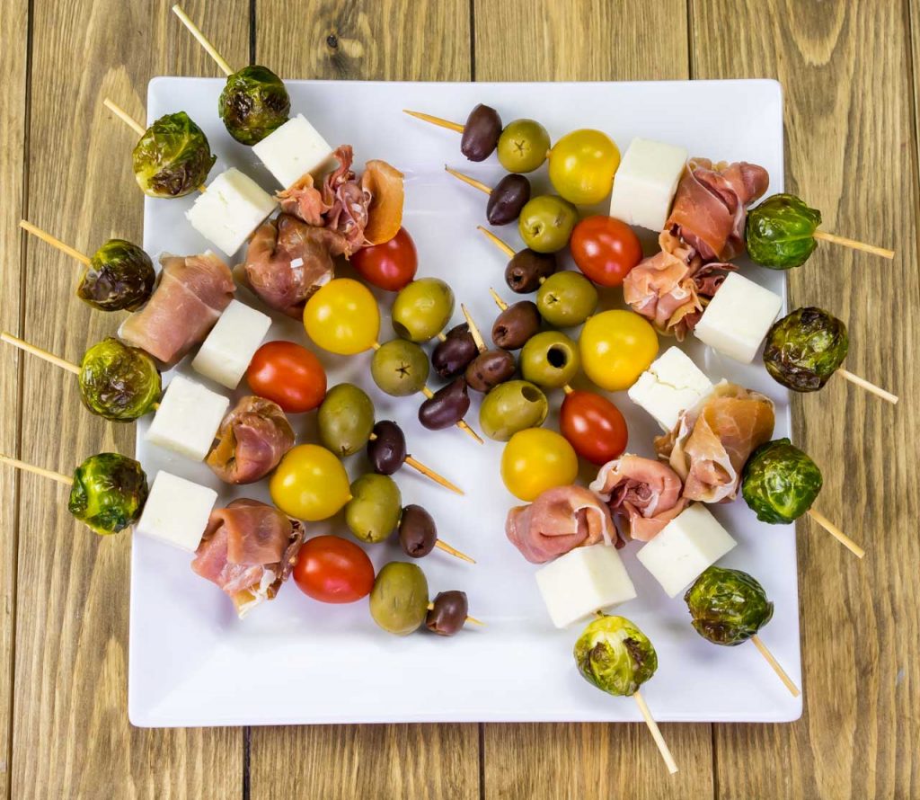 Assemble your skewers as follows: brussels sprout, prosciutto, cherry tomato, cheese, and olives.