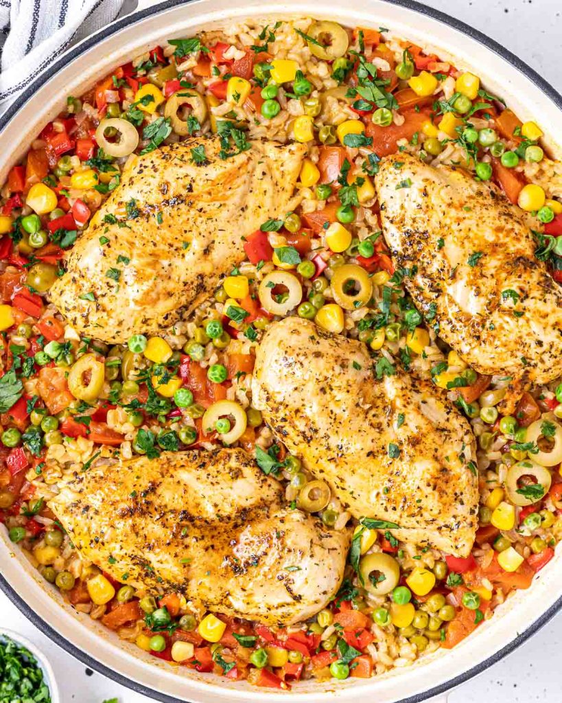 I used perfectly-seasoned chicken breasts, onion, bell peppers, lots of garlic, olives, diced tomatoes, brown rice, and some frozen vegetables.