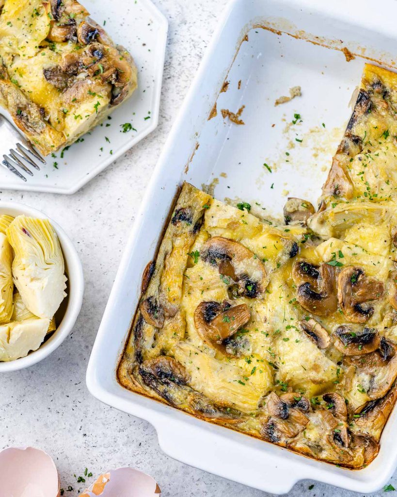 My NEW obsession is adding artichoke hearts to my morning eggs. I’ve been throwing them into egg scrambles, and omelets…so naturally this egg casserole was next on my list to try, and it’s by far my current FAVORITE!