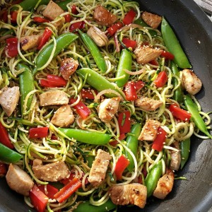 Add the prepared sauce and cook, stirring constantly, for 2 minutes until the sauce thickens slightly. Return the cooked chicken back to the pan, stirring to combine, then add the zucchini noodles and cook, tossing to coat, for 1-2 minutes.