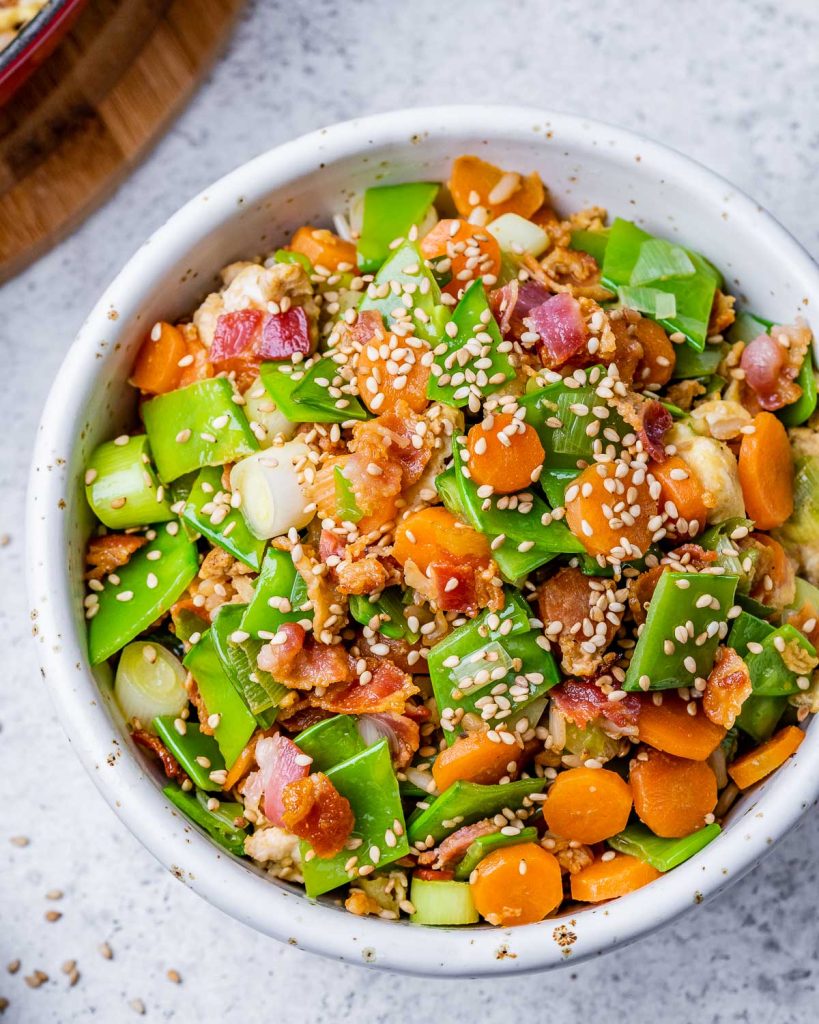 I am such a savory food person that I’ll absolutely enjoy this Bacon & Egg Fried Rice for breakfast, lunch, OR dinner.