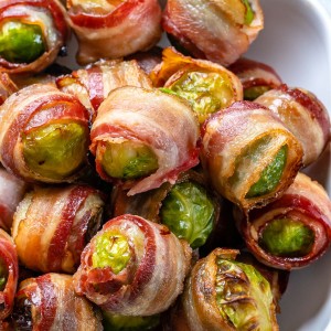 - Place a Brussels sprout at the top of a piece of bacon and roll up around so that it evenly wraps the sprout, depending on the size of your sprouts, you may want to only use half a slice of bacon for each.