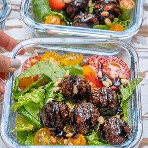 Serve meatballs next to your favorite salad, veggie, or quinoa in glass containers and refrigerate for up to 3-5 days.