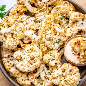 The Bang Bang Sauce drizzle is a very welcome addition and turns these roasted cauliflower steaks into CRAVEWORTHY snack food while being covert healthy!