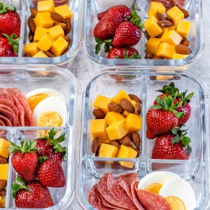 To keep everything fresh and maintain the texture of ingredients, place your proteins and cheese separately from the strawberries.