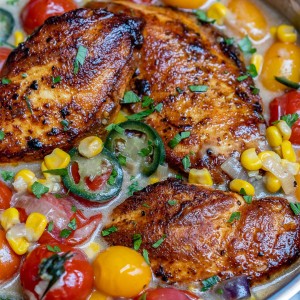 Blackened Chicken with Creamy Corn + Ripe Cherry Tomatoes