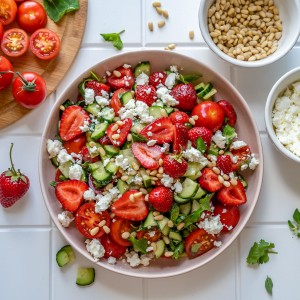 - In a medium bowl combine all of your prepped ingredients for the salad.