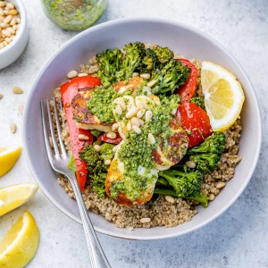 - Divide your cooked quinoa equally among 4 bowls. Top with your garlic veggies, halloumi, and a tablespoon of pesto sauce on each.