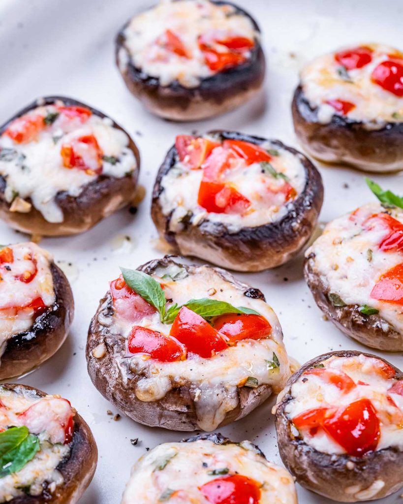 - Fill/stuff each mushroom with your bruschetta mixture.