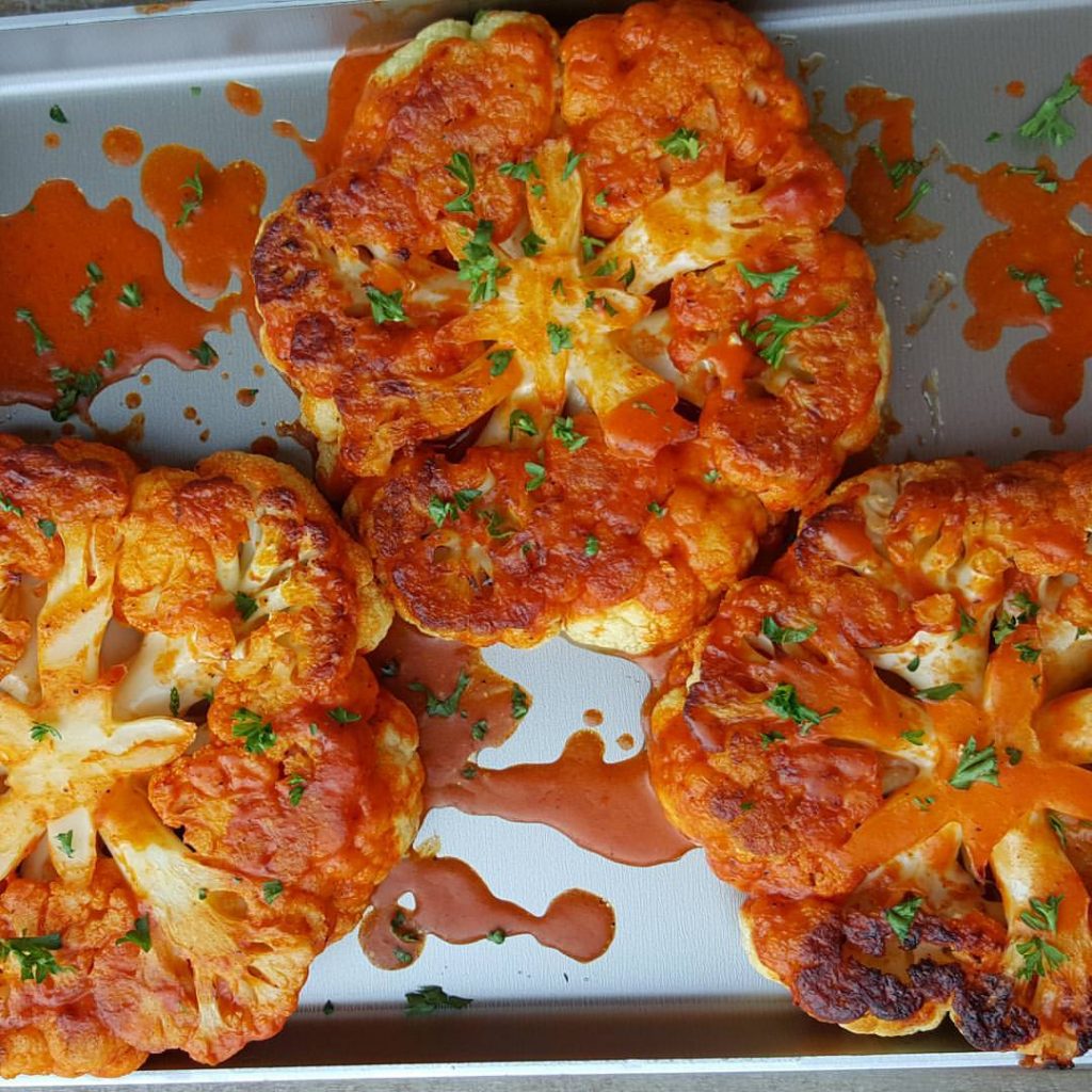 Transfer to the oven and bake for 10-15 minutes on one side, then remove from oven, and brush with wing sauce, flipping the steak over to the other side. Place the cauliflower back in the oven for another 10 minutes or so.