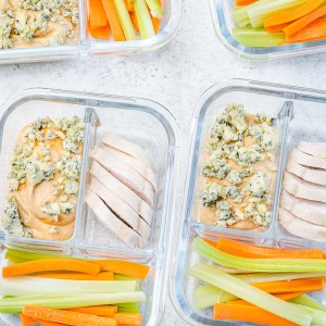 - Slice the celery and carrots into sticks and add them to your containers next to the chicken.