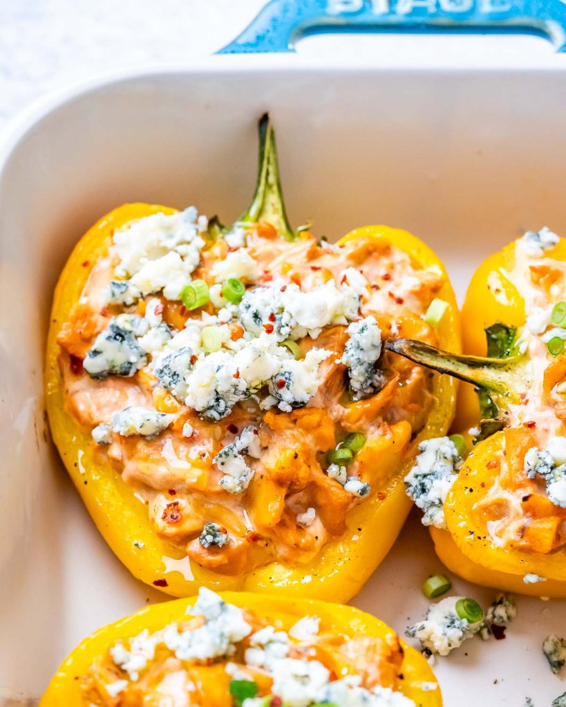 Filled with a creamy, spicy mixture of shredded chicken, hot sauce, and blue cheese, these peppers are a serious flavor explosion.