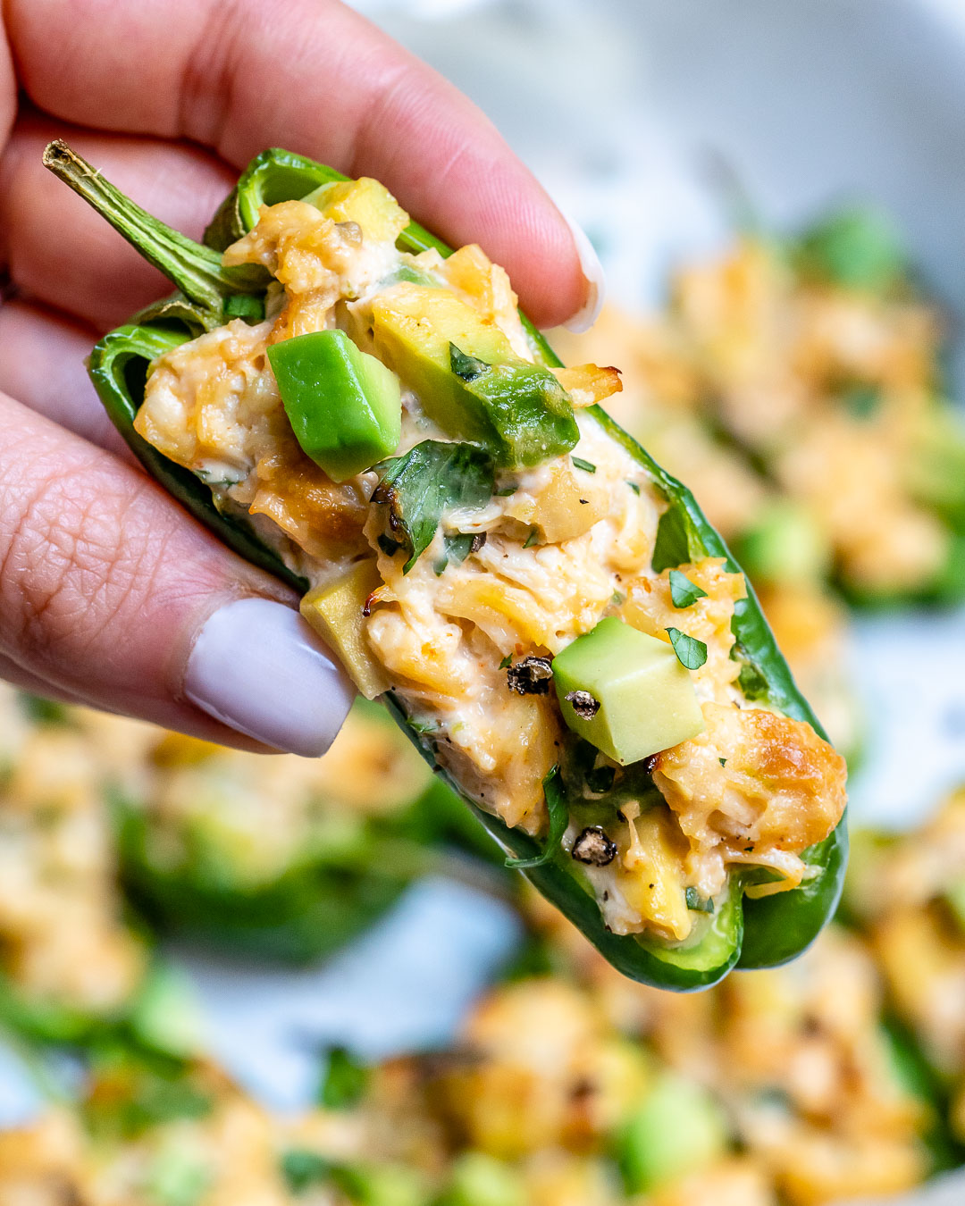 Hand holding a buffalo chicken stuffed Anaheim pepper for close up image.