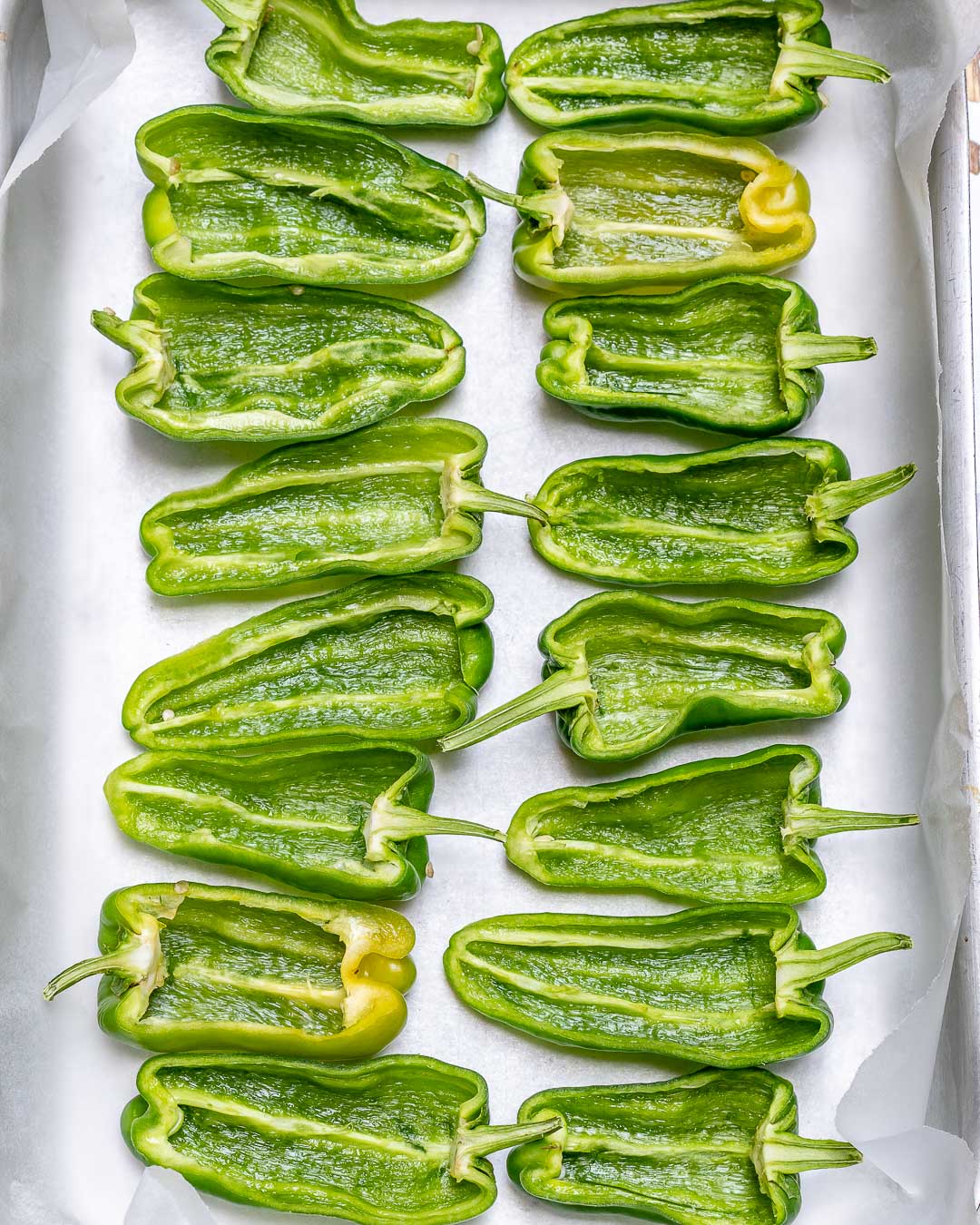 Two rows of Anaheim peppers on a baking sheet.