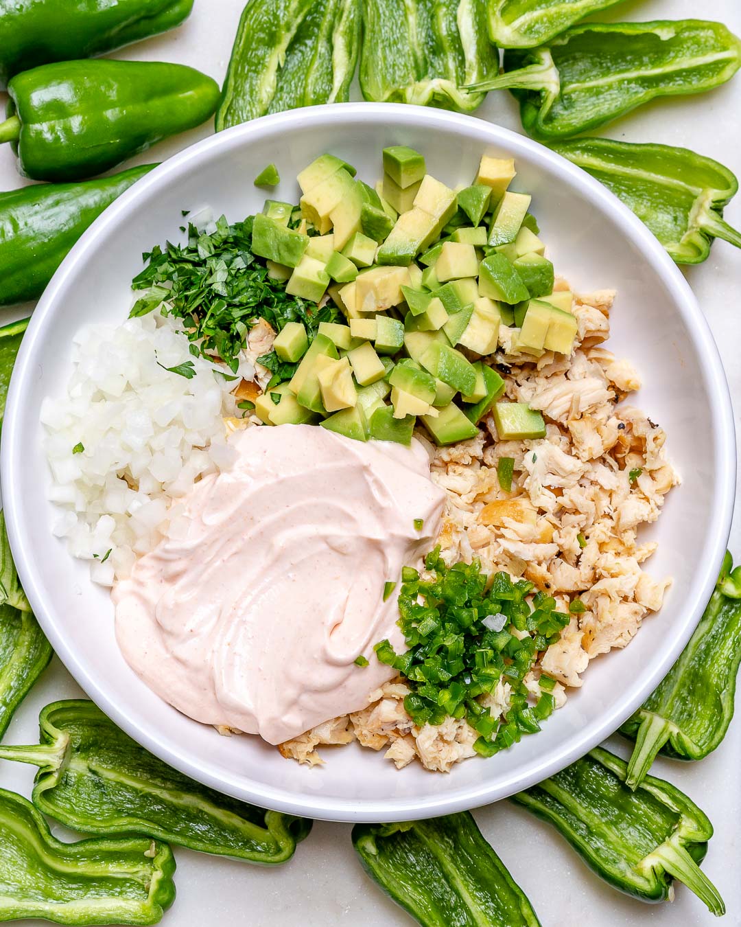 Step 2. Combine all remaining ingredients in a large bowl; set aside half of your avocado pieces to top each pepper as shown once baked. (I combine half the avocado into the filling, leaving half to set on top of each pepper after baking)