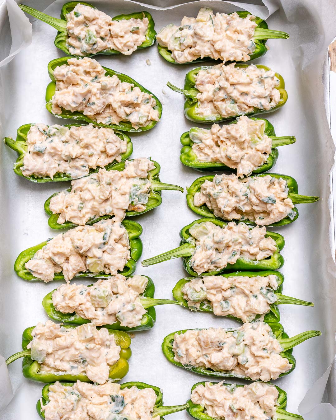 Two rows of Anaheim Peppers stuffed with buffalo chicken salad on a baking sheet.