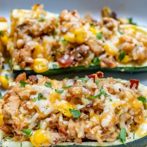 Carefully spoon this mixture into zucchini boats then top with remaining cheese.