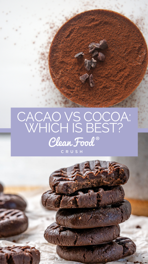 Both cocoa and cacao provide health benefits and are a more natural, lower sugar, and lower fat version of traditional chocolate. If all you have on hand is cocoa powder, that’s fine to use. However, when you have a choice at the grocery store, reach for the less processed and more nutrient-dense raw cacao powder to satisfy your chocolate cravings while also taking advantage of its awesome health benefits in all of your homemade treats!