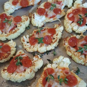 - In the mean time, place a tiny tsp dollop of pizza sauce onto the center of each cauliflower bite, followed by a tiny pinch of natural mozzarella(or fav Italian cheese), and pepperoni. I cut my pepperoni with a mini cookie cutter, alternately-you can cut larger pepperoni into fourths.