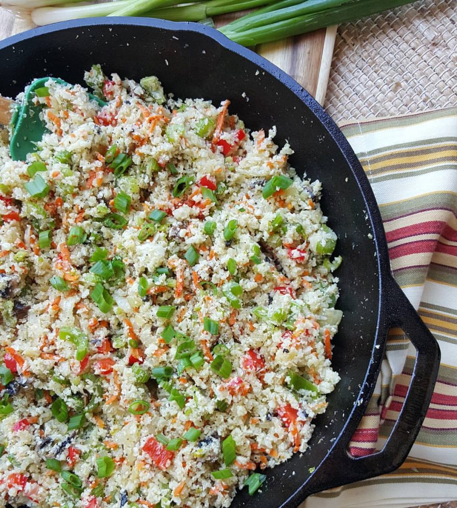 Stir in riced cauliflower, green onions and soy sauce mixture. Cook, stirring constantly, until heated through and the cauliflower is tender, about 4 minutes.