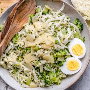 - Sprinkle parmesan cheese over the cabbage and broccoli then drizzle with your homemade Caesar dressing.