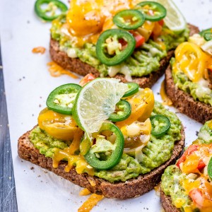 - Top toasted bread with mashed avocado mixture, then top it with cherry tomatoes, shredded cheese and jalapeño slices.