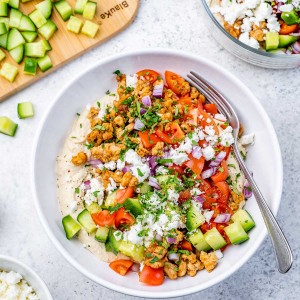 - Divide your hummus equally among 4 meal prep bowls or plates. Top each serving equally with the cooked ground chicken, tomatoes, cucumber, onion, feta cheese, and parsley.