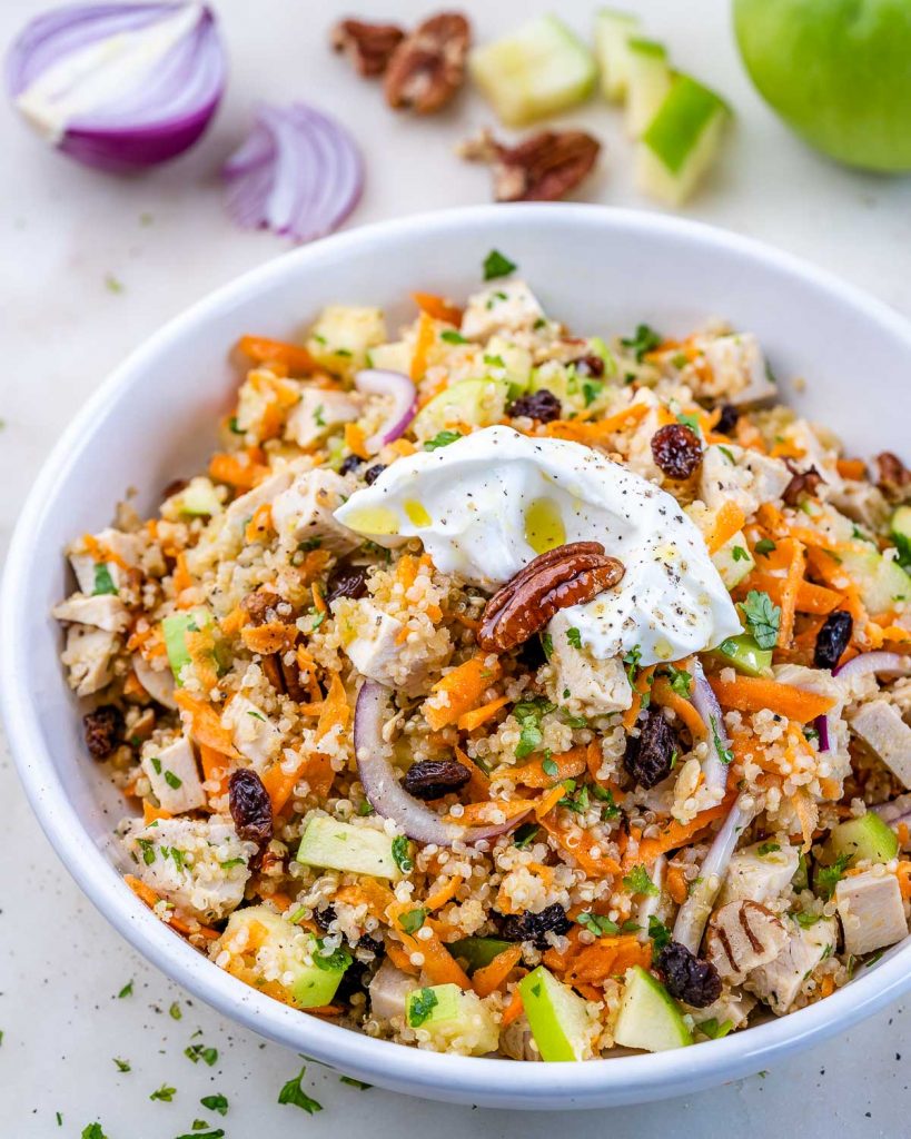 I had cooked cold quinoa and leftover grilled chicken in the fridge, so I chopped up the chicken then added the remaining ingredients because that’s what I had on hand that day.
