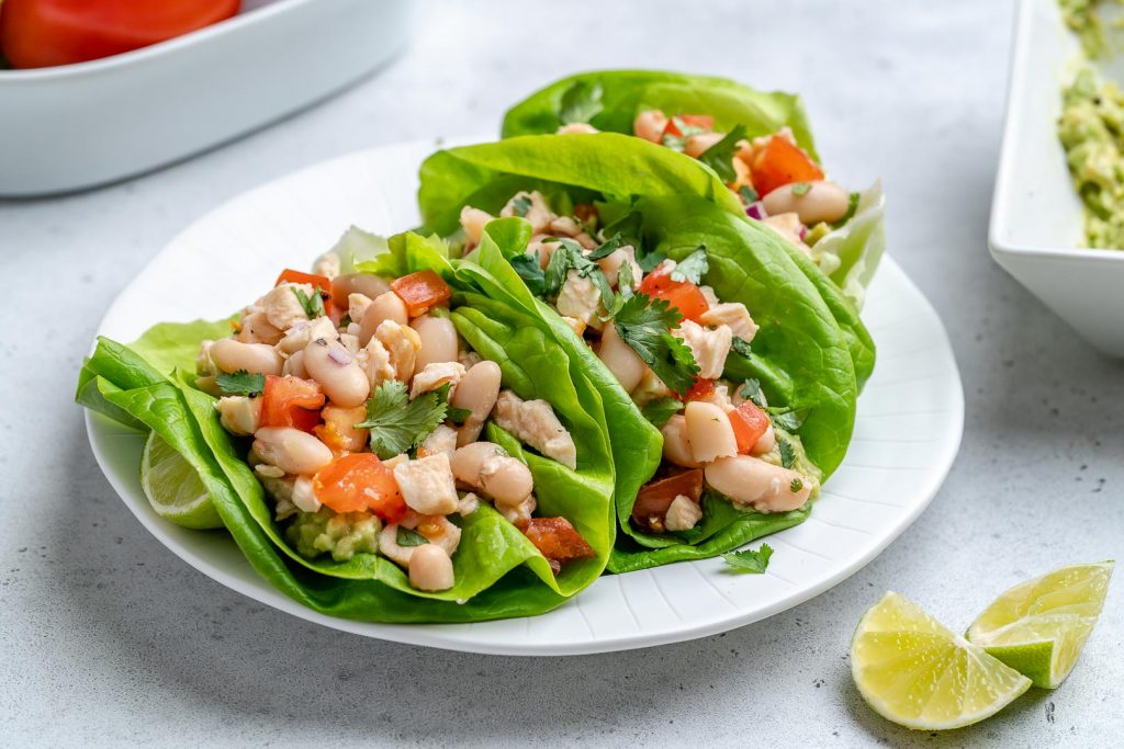 Rinse your lettuce leaves really well, then allow to air dry on towels while preparing your toppings.Mash guacamole ingredients together to desired consistency. Spread 2 Tablespoons of freshly made guacamole (per serving) onto your lettuce leaves.