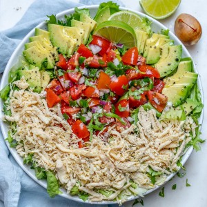 - Divide the greens between 2 bowls, then top with shredded chicken, avocado, and homemade salsa, as shown.