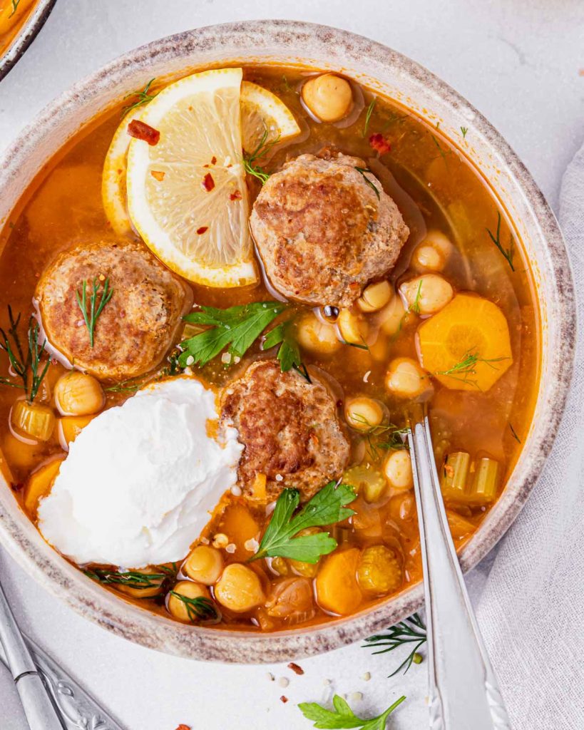 Hearty meatballs, flavorful veggies, fiber-packed creamy chickpeas, and a touch of freshly squeezed lemon juice + zest to keep it bright!