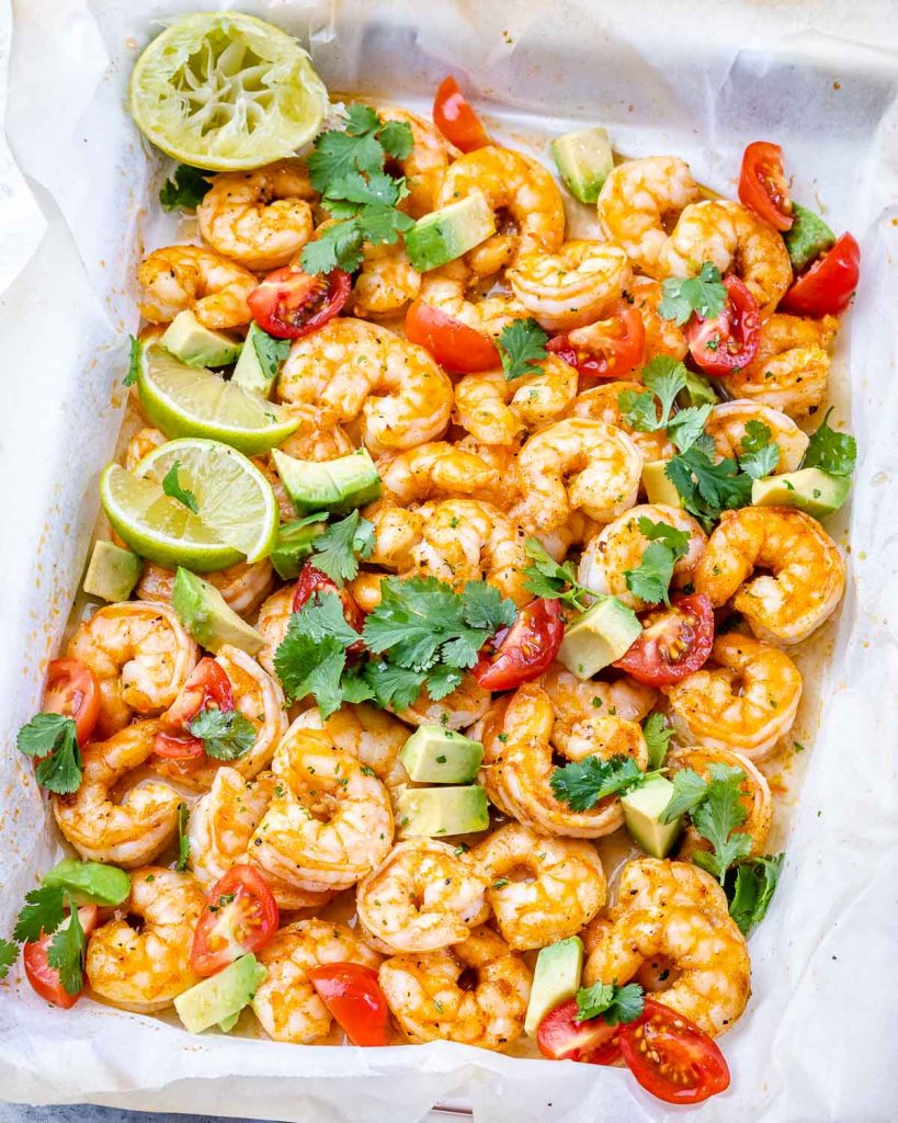 - Once your shrimp are done cooking, remove from oven, then top with tomatoes, avocado, and cilantro leaves as shown if desired.