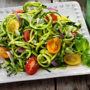 Spiral courgette noodles and tomatoes with chimichurri and Parmesan cheese
