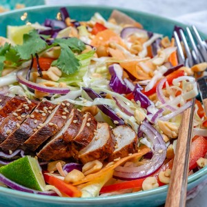 • Top with sliced chicken, chopped peanuts, fresh squeezed lime, and fresh chopped cilantro leaves.
