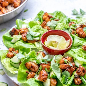 - Arrange lettuce leaves nicely on a large platter. You can double them up if desired, to better hold (transport,) the filling.