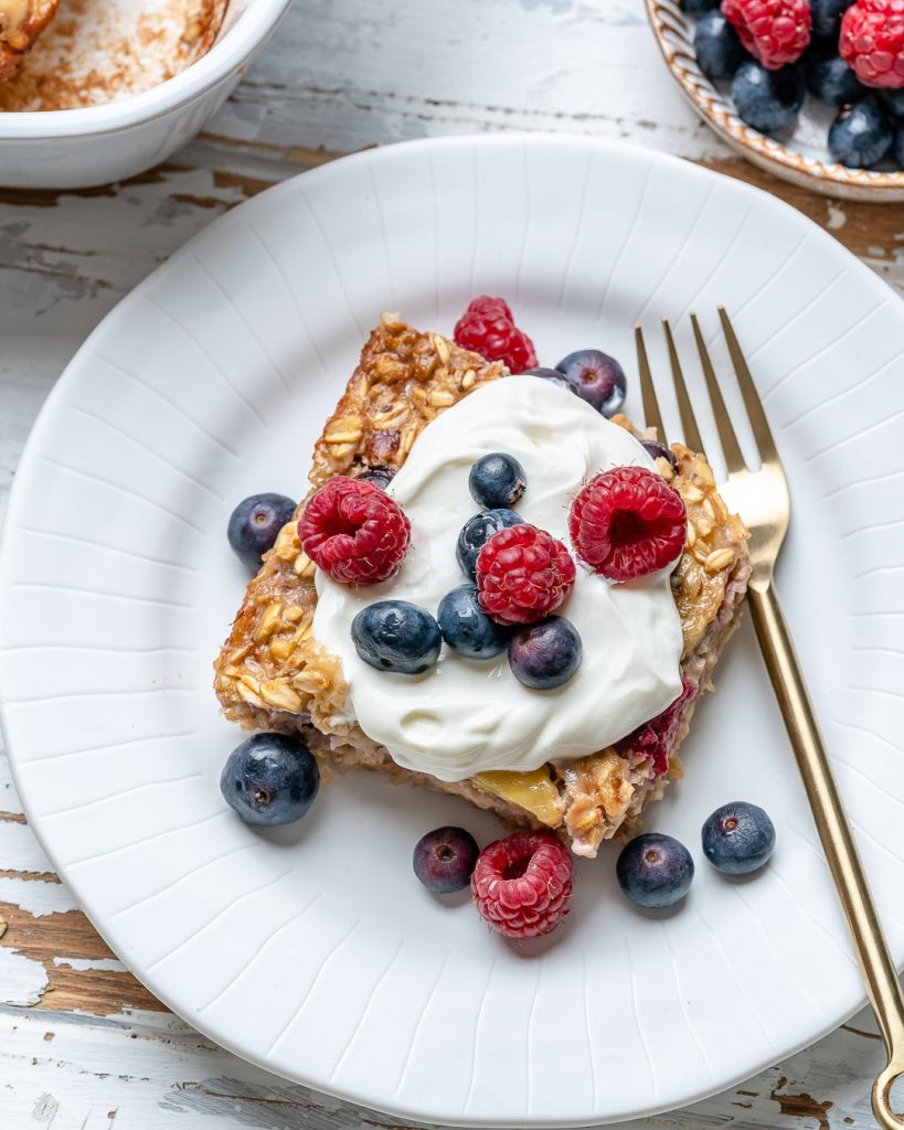 Add in your oats and stir well until evenly combined. If time allows let mixture sit for 30 minutes to soak up the oats. Next, fold in chopped nuts, sliced bananas, and berries. Transfer the oat mixture to the prepared baking pan.