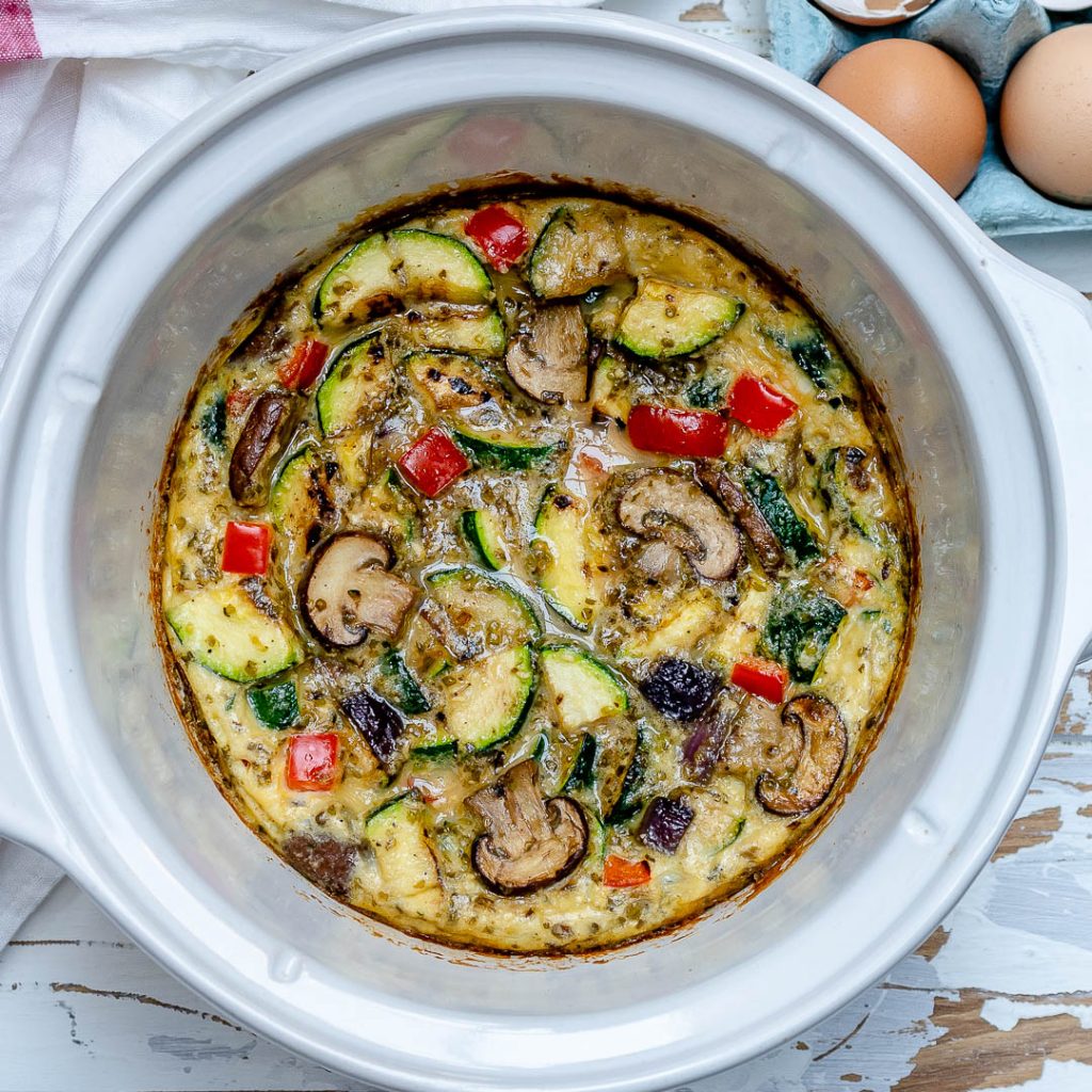 Meanwhile, in a mixing bowl, whisk eggs, Parmesan cheese, dried oregano, a pinch of sea salt and pepper. Pour egg mixture into slow cooker and give it a gentle stir. Cook on HIGH for 1-2 hours or on LOW 3-4, or until eggs are set in the center.