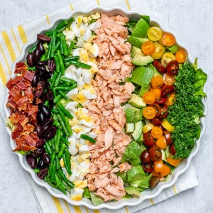 - Add remaining Cobb layers as shown: flaked salmon, avocado, tomatoes, boiled eggs, green beans, olives, bacon and dill.