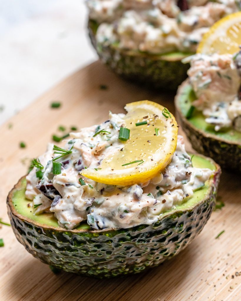 - Divide the salmon mixture evenly between the avocado halves and garnish with lemon wedges is desired.