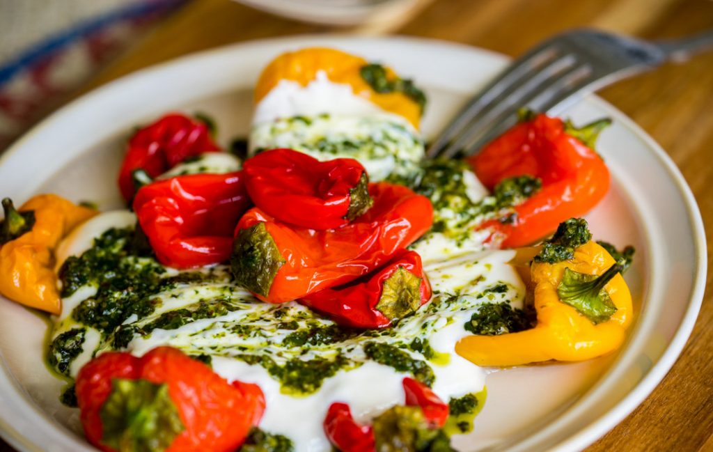 - Place your roasted peppers on a large serving plate, add yogurt, top with homemade pesto sauce, and pine nuts.
