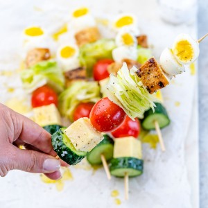 - Arrange your Cobb skewers nicely onto a platter and very lightly drizzle with extra virgin olive oil. Sprinkle with sea salt and freshly ground black pepper if desired.