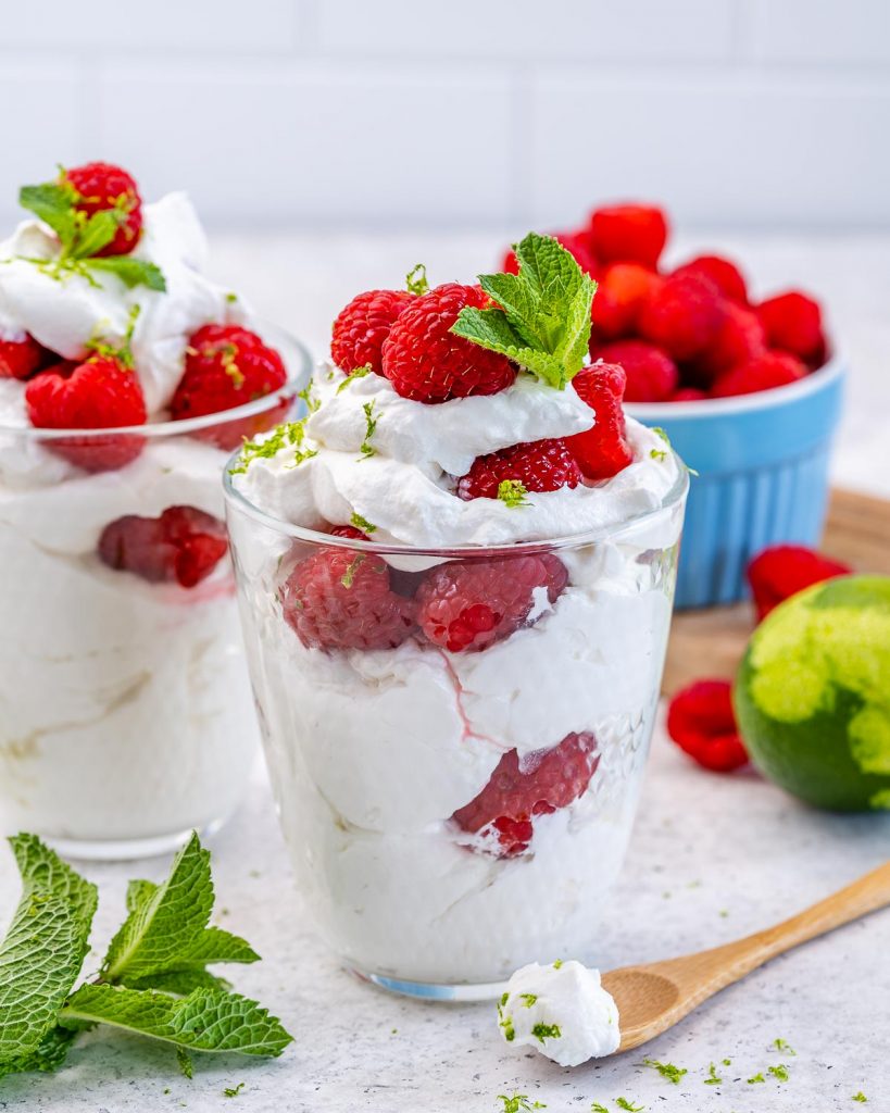- Serve immediately in small cups or jars topped with fresh berries as shown, then garnish with freshly grated lime zest and mint.