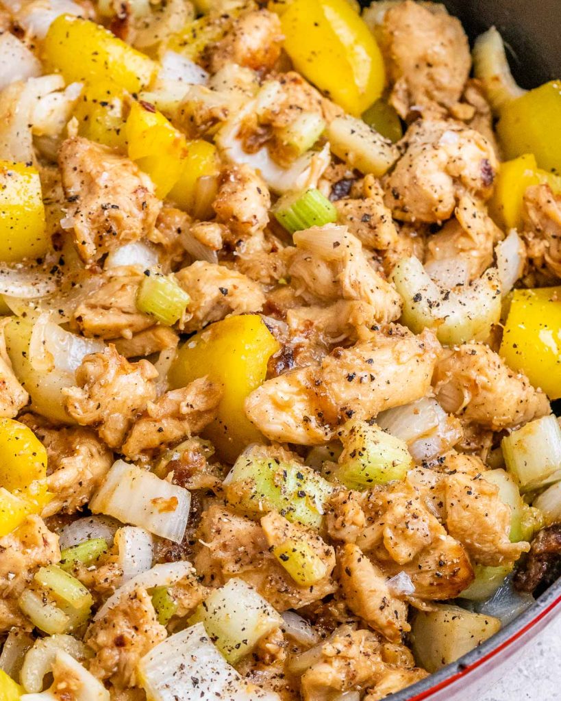 - Add in the garlic, onion, celery, and bell pepper. Cook, stirring frequently for 6-8 minutes, or until chicken is cooked through and veggies are tender-crisp.