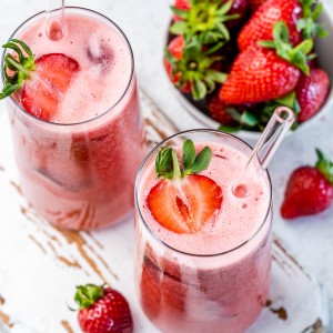 - Add lots of ice and additional chopped strawberries equally among 4 tall glasses as desired and pour in your pink drink.