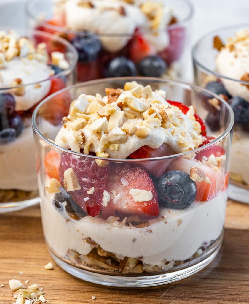Top with fresh berries. Repeat layers as desired. Depending on the size of the serving cups you’re using, you may want 2 or 3 layers.