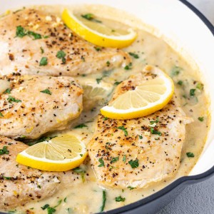 - Return your chicken to the hot skillet and garnish with lemon slices and freshly chopped parsley.