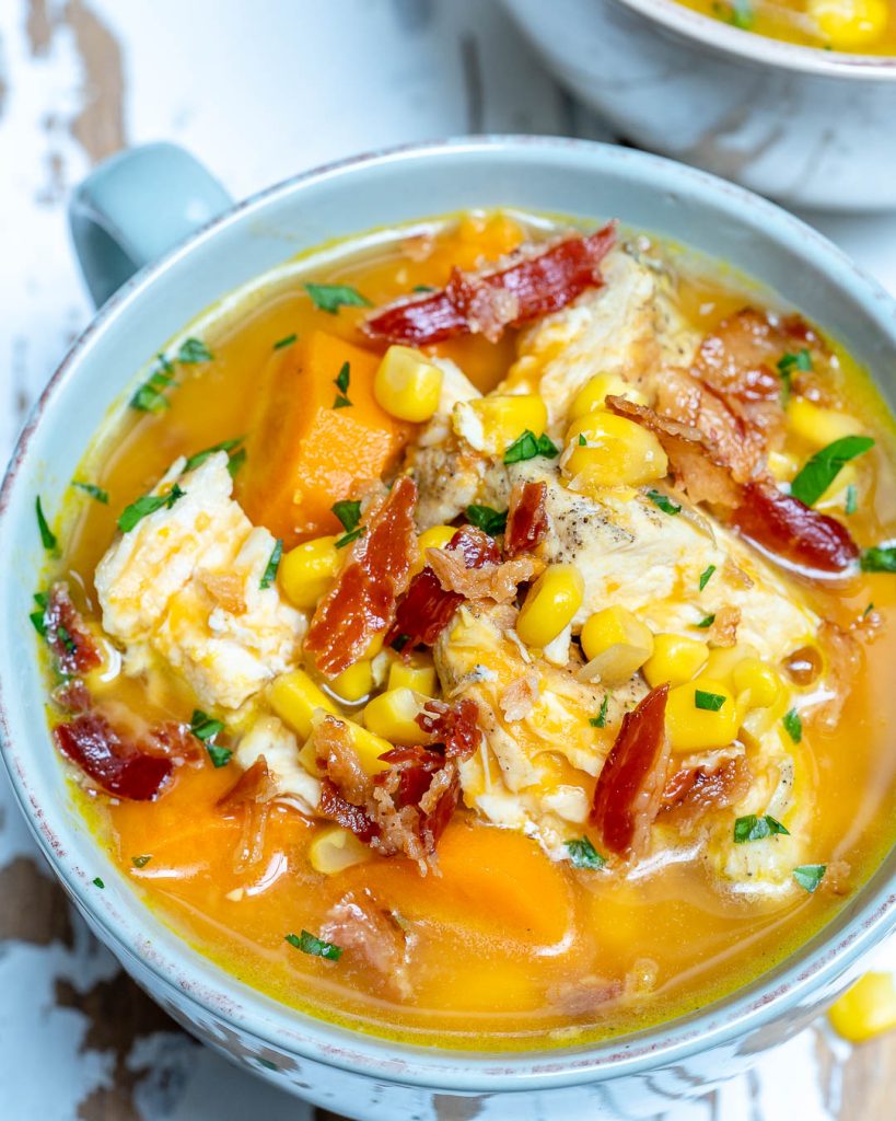 Add garlic, onion, sweet potatoes, corn, bone broth, and simmer, stirring occasionally, until the chicken is fully cooked, about 20 minutes.