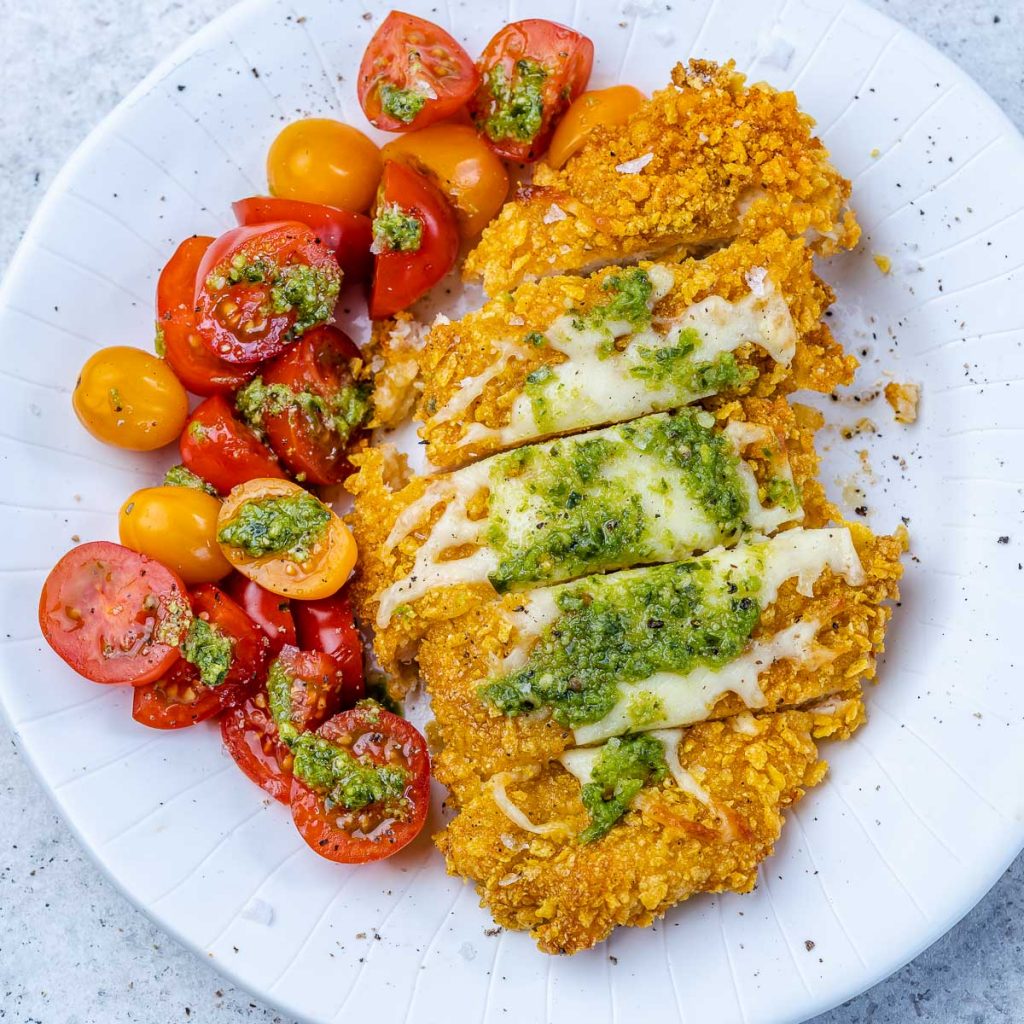 - Drizzle your chicken cutlets with a Tablespoon of pesto sauce and serve with cherry tomatoes.